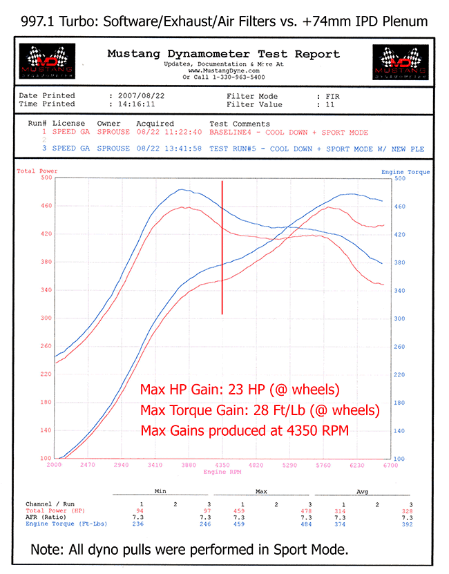 The patented IPD Plenum design is a highly effective upgrade with all forced induction systems, including the 997 Turbo. The power and torque gains provided by the IPD Plenum are substantial, consistently surpassing factory power curves from start to redline. The most significant power increases occur in the midrange, where they are most needed.