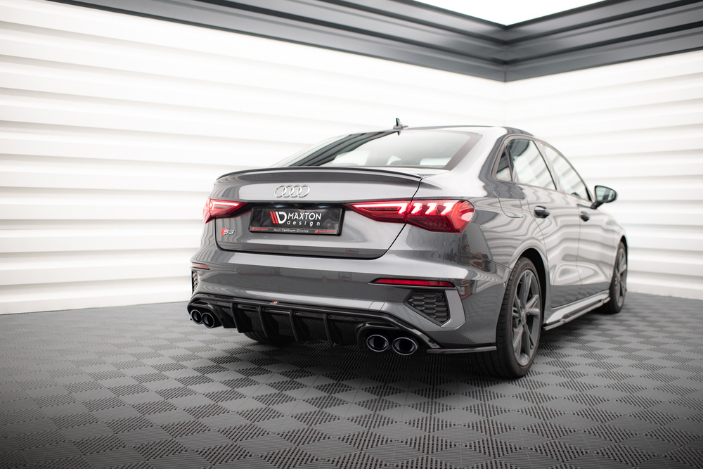 The offer of the Polish brand, Maxton Design, is abundant with sprauncy and modernized optical vehicle tuning. The company has an advanced factory at its disposal, and it is there were durable spoilers, bumpers, side skirts, diffusers, and splitters are made. Tuning fans will certainly be interested in original accessories, as well. These include wings, frames for lights, and eyebrows. The mentioned elements allow you to alter the visuals of your machine while also enhancing its aerodynamics. In the production processes of the Maxton Design components only the best materials are used, ones with proper certificates. Audi A3 S-Line Sedan 8Y in mind this rear valance with exhaust ends imitation was created. The product has an interesting design and is delivered fit to be installed right away.